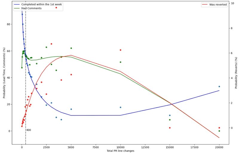 この3つを同じグラフに重ねると、ひとつの目安が見えてきます。1PRあたりおおむね400行以下であれば、1週間以内に完了する確率、レビューコメントが付く確率、リバートなしで通る確率のバランスが取りやすくなります。